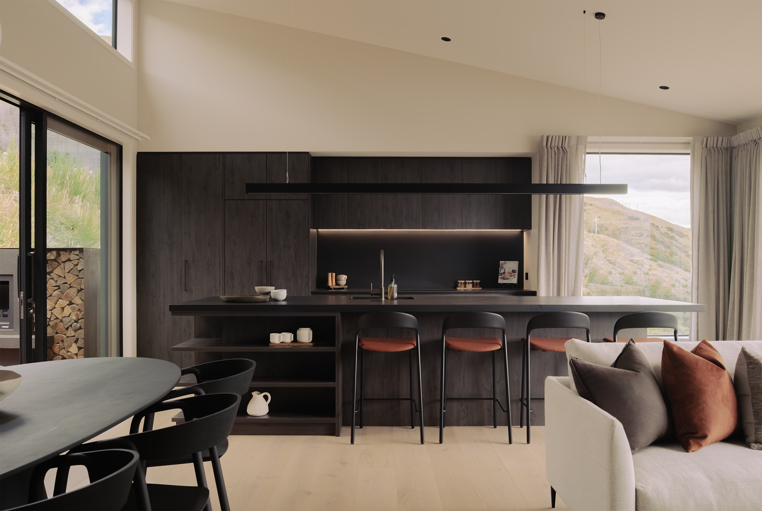 Dusky oak tones are set against charred black ash and slate, creating a home that feels quietly dramatic yet composed. Modern in form, but never stark — colour is used sparingly and with intent, shaping the mood as you move from space to space.